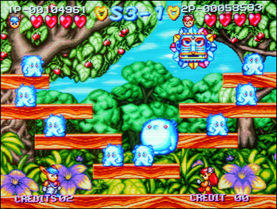 Snow Brothers, and similar style games. The two characters can actually "blow up" enemies by