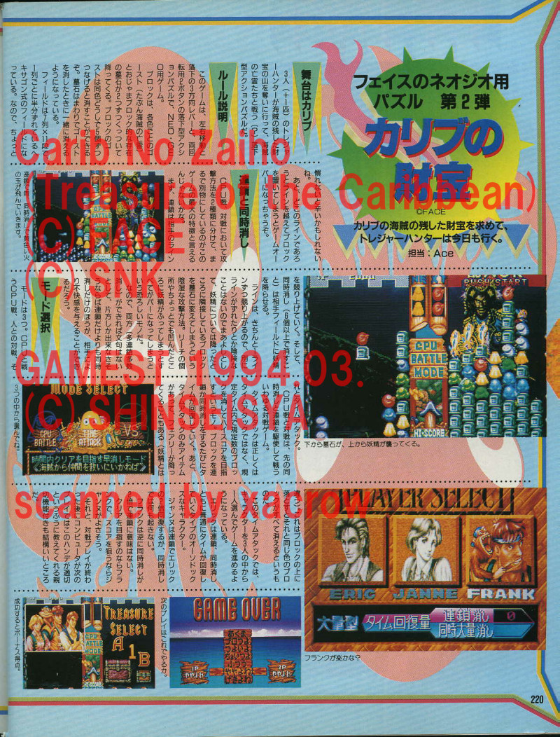 -- March 1994 -- Gamest #109, a Japanese video game publication, publishes a short article with screenshots of Caribbean.