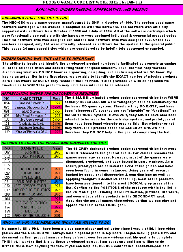 The back side page of the NEOGEO Software Product Number List (Please keep in mind that I originally compiled and arranged this print out back in 2004)